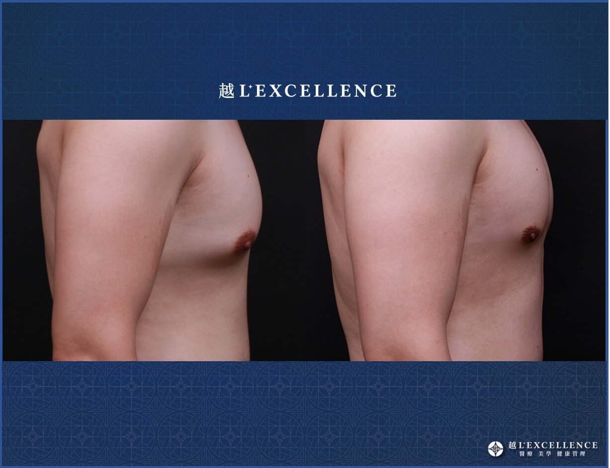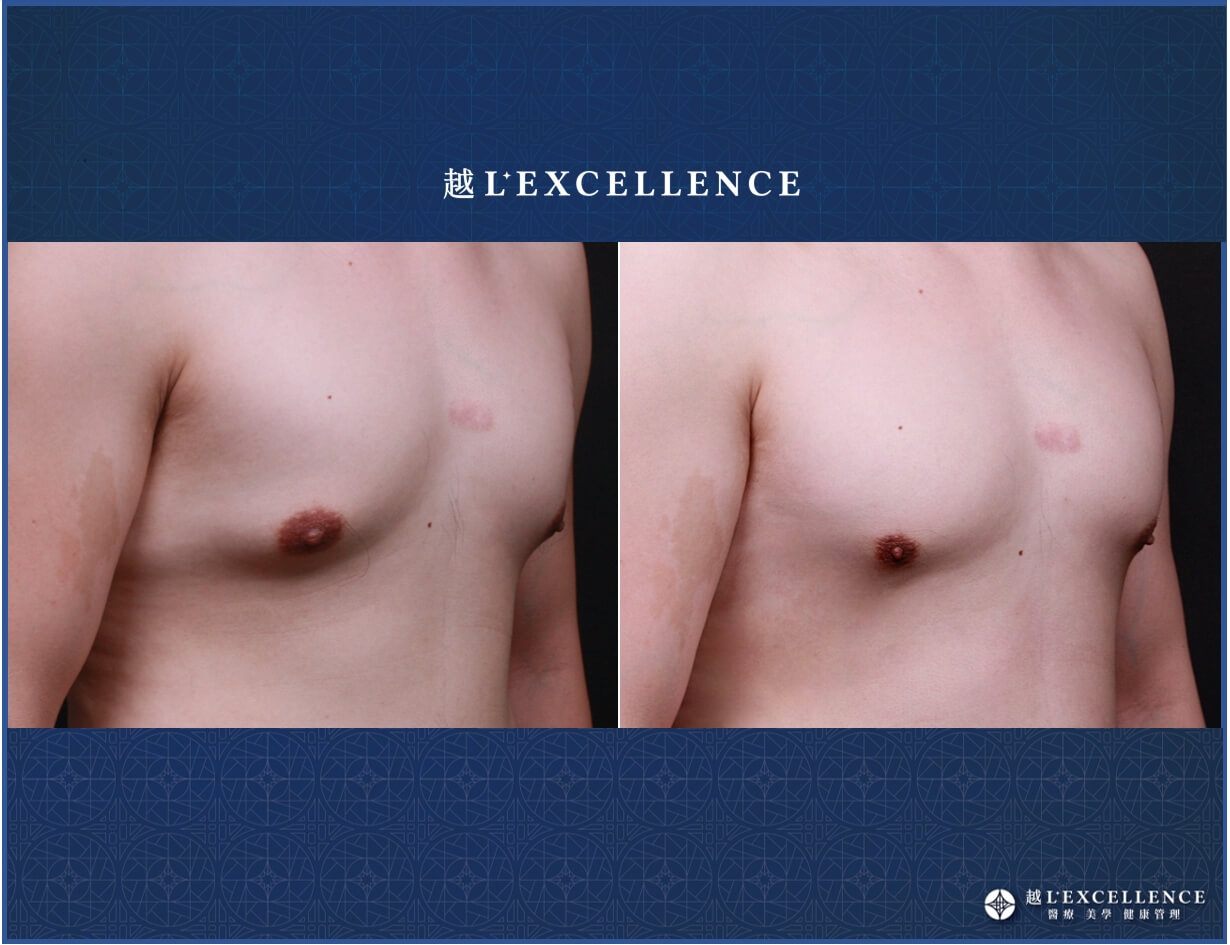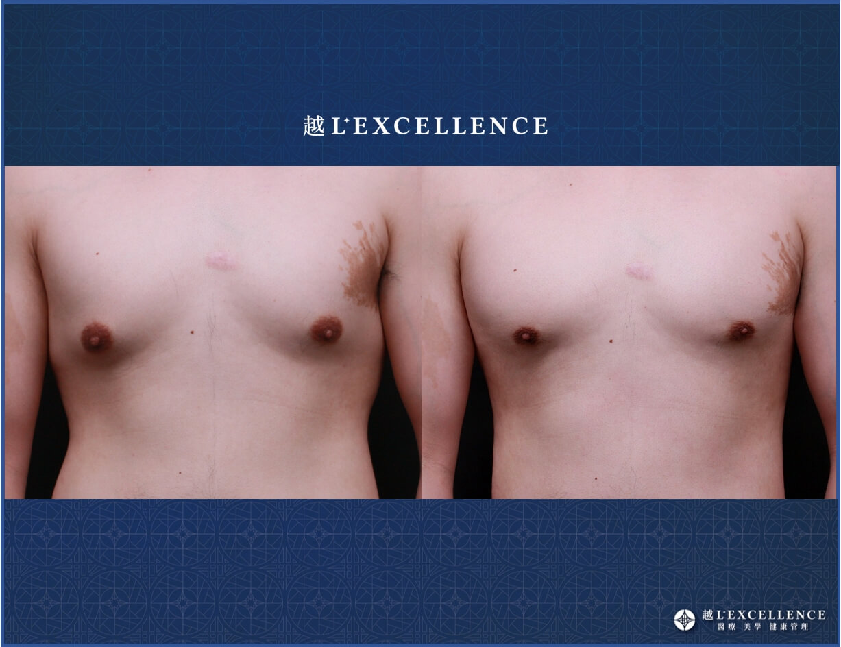 此案例為男性女乳症治療者,透過長期健身運動後,依舊無法完整改善乳暈四周隆起的乳房組織,藉由抽補脂術,將胸部下緣多餘脂肪組織抽除後,再將脂肪補回上胸,雕塑男性胸肌細條感。抽脂傷口為乳暈下緣1公分寬度,術後不易被發現。