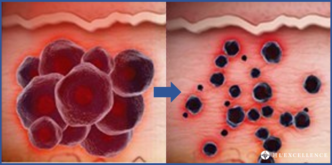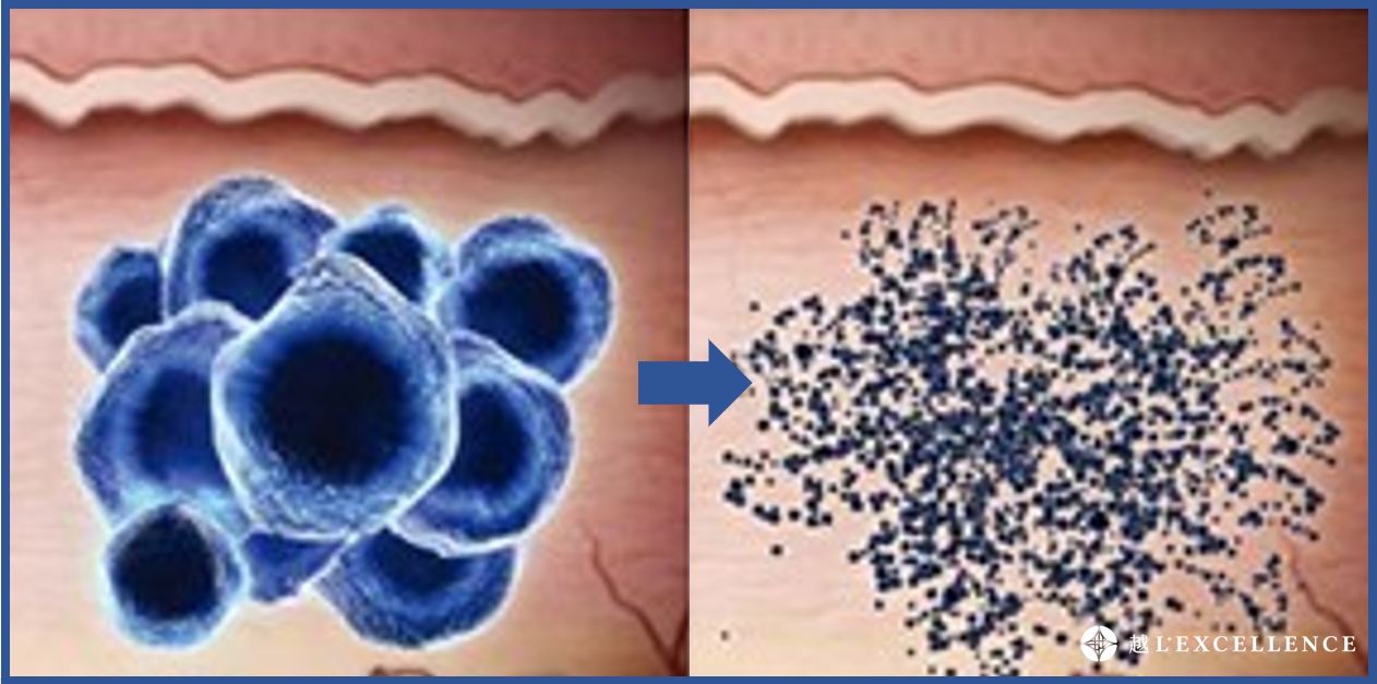 奈秒治療,光熱與部分光震效應作用,將色彩粒子擊碎成小粒子。
