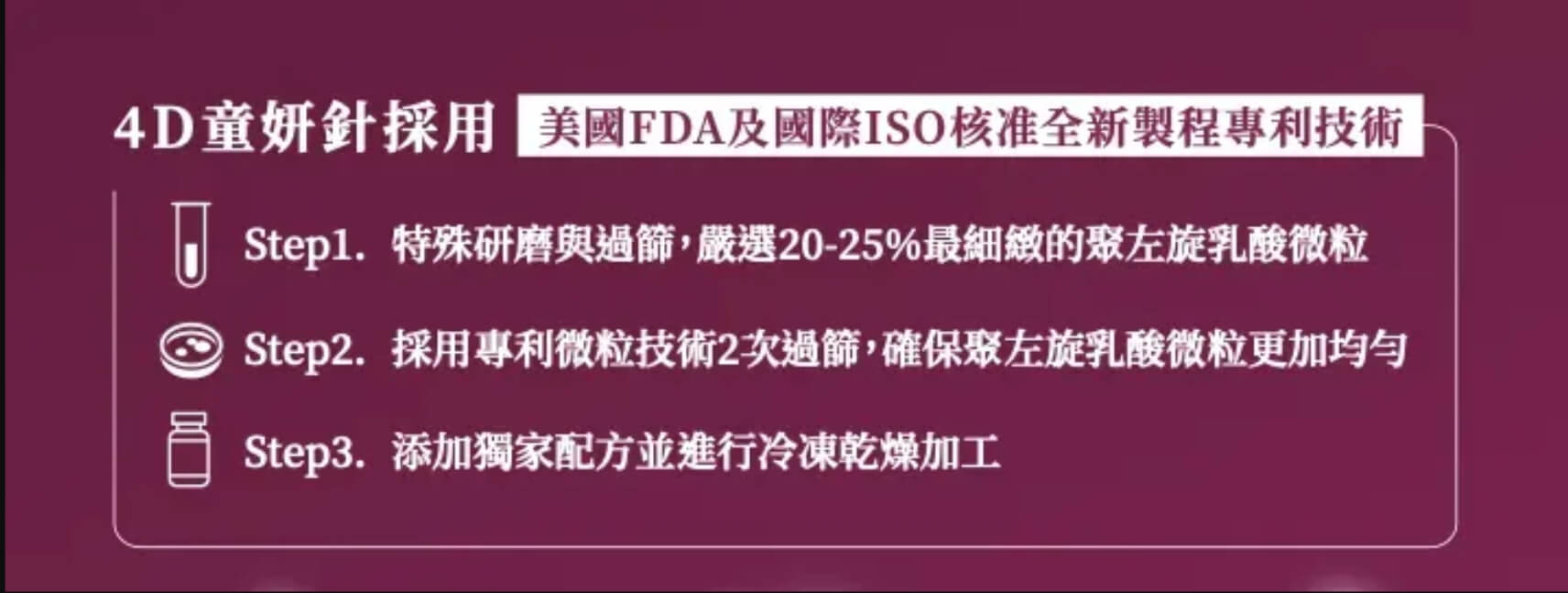 童妍針已在全球上市超過 20 年,深受好萊塢巨星、名媛貴婦的喜愛,比起過去的 3D 童妍針(3D 聚左旋乳酸),目前市面上的4D 童妍針採用美國 FDA 核准、國際 ISO認證的全新製程專利技術,主要成分聚左旋乳酸微粒更加均勻細緻,到診所之後即泡即用無需等待,術後回家免按摩,沒有注射填充物所需的恢復期,效果上也較 過去的3D 童妍針能刺激最多 2 倍的膠原蛋白增生。效果加倍,維持年輕美麗的力度也更加分。去年推出的真童妍拉提術若搭配全新升級的4D童妍針,拉提緊緻效果也會更好,也更值得納入年度保養計畫。