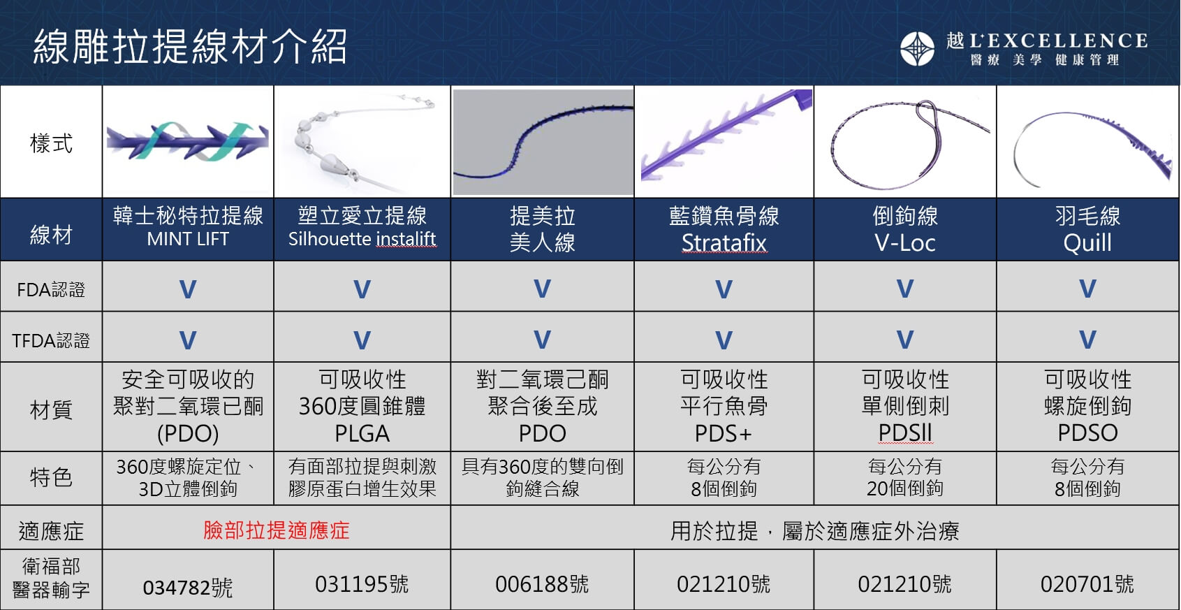 目前台灣地區已由官方核准,可合法使用於線材產品如下:MINT LIFT 秘線拉提、Silhouette Instalift塑立愛塑型線、Stratafix藍鑽魚骨線、V-LOC倒鉤線、Quill羽毛線、提美拉美人線,並於療程上,已累積不少臨床案例,是消費者可以安心選擇的線材種類,材質與特色提供參考。