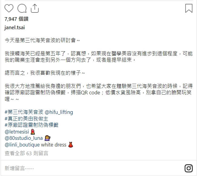 現代人買包、買車都重視正貨,而關乎面子的醫美療程,消費者卻反而容易忽視「認證」,常被低價所牽引。蔡淑臻也提醒想體驗「第三代海芙音波」的人,最重要的是要選擇正貨!千萬不要貪小便宜,很可能施打到水貨或仿冒品增加風險,輕則沒有效果或維持時間短,嚴重者可能會起水泡、燙傷,反而得不償失。蔡淑臻不藏私公開自己的療程安心撇步:第一,查詢海芙音波原廠官網,確認診所是否在原廠列出的名單中;第二,確認醫師具備原廠合格證書;第三,檢查機器的機身、把手和探頭上是否有原廠雷射防偽標籤;第四,也可以用手機掃描機身上的QR code,同樣能進入原廠官網查詢診所有沒有獲得海芙音波的年度合格認證。在施作任何醫美療程之前,多上心多留意,就能美得安心安全又自然,讓人可以驕傲大喊「真正的美,由我作主」。