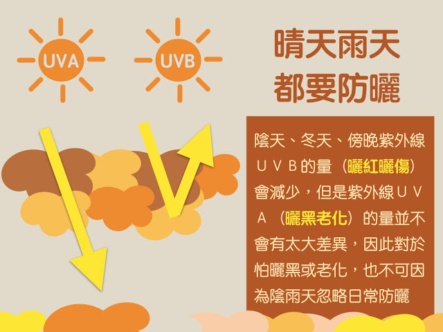 不管陰天或晴天,紫外線指數高低,陰天會減少紫外線UVB的量(曬紅曬傷),但是不穎想到UVA的量(曬黑老化),因此對於怕曬黑或黑斑者,也不可因紫外線指數低就忽略日常防曬