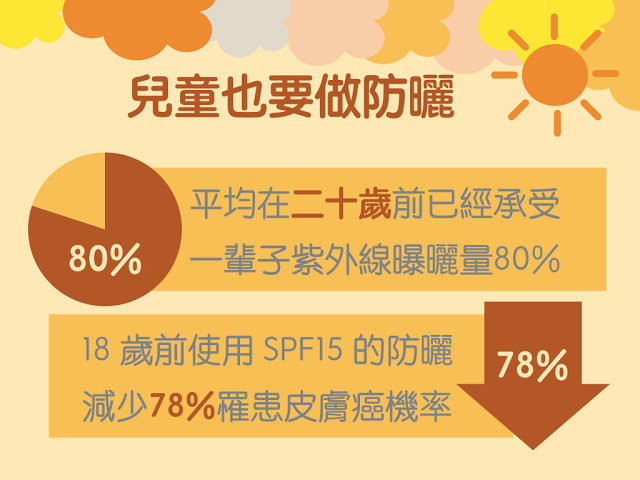 據統計平均在二十歲前已經承受紫外線曝曬量80%,如果在18歲前使用SPF15的防曬,可以減少一生中罹患皮膚癌的機率達78%,而黑色素腫瘤的形成,一般相信與20歲前的曬傷有明顯關聯。所以在孩童時期做防曬就是非常重要的課題,國外甚至把兒童防曬列入學校教育的一部份,希望減少未來皮膚癌的罹患機率。