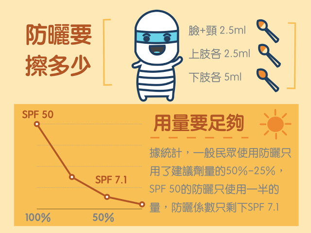 正確防曬塗抹的量,臉加上脖子半個茶匙2.5ml,上肢各半茶匙,下肢各一茶匙,所以認真擦防曬其實防曬用量是很兇的。