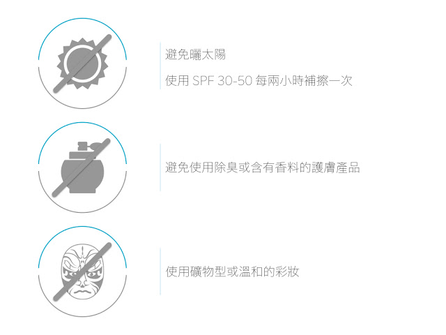 - 療程後1週內的恢復期,避免刺激保養品的使用。例如:酒精、香料、左旋C、果酸、A酸、水楊酸、杜鵑花酸、或其他酸性刺激產品使用並加強保濕與防曬。