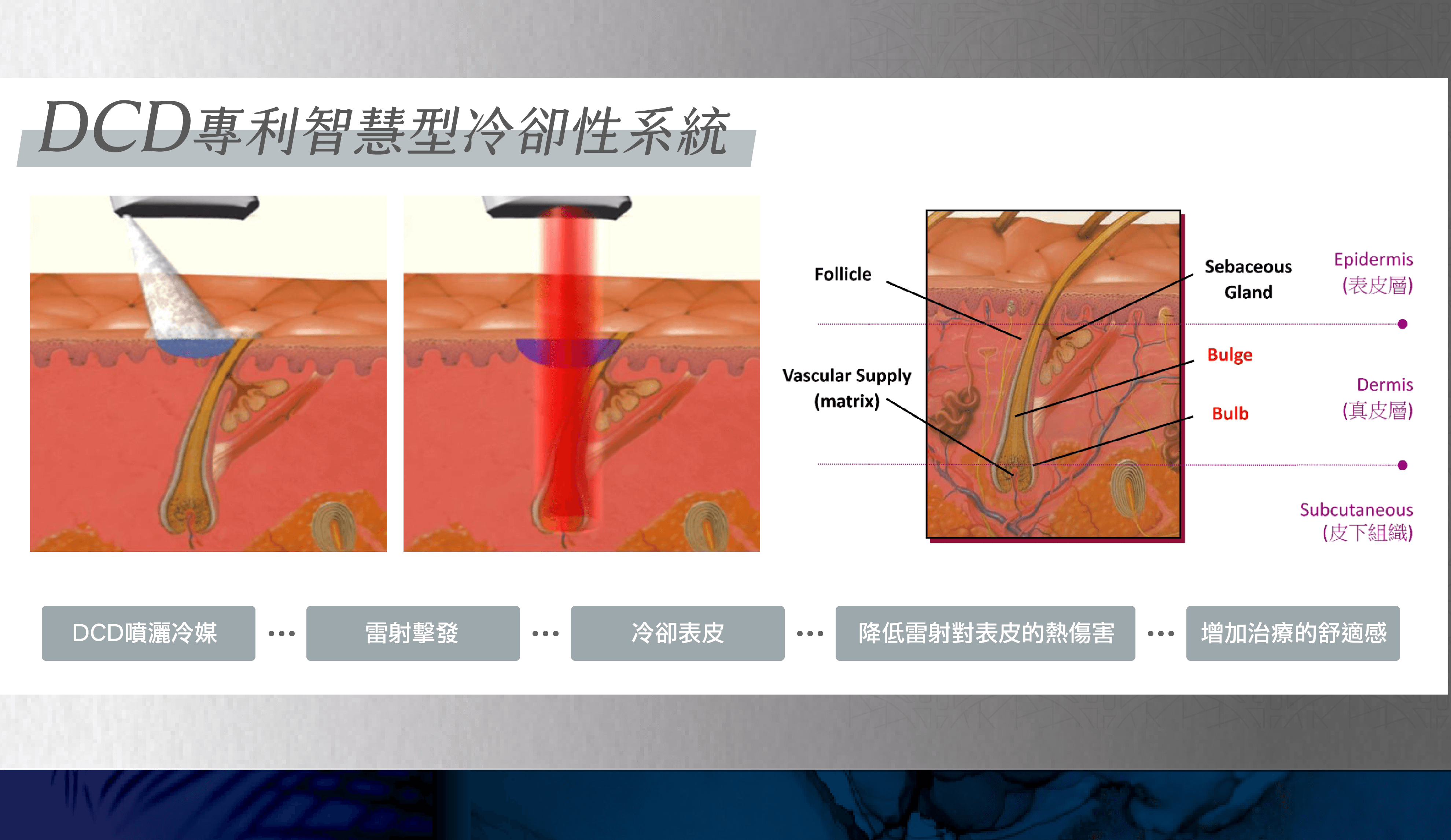 Bulb/Bulge為提供毛髮生長所需養分的主要部位,由毛幹吸收雷射光所產生熱能,需有效傳達至Bulb/Bulge才能達成時間性除毛的效果。