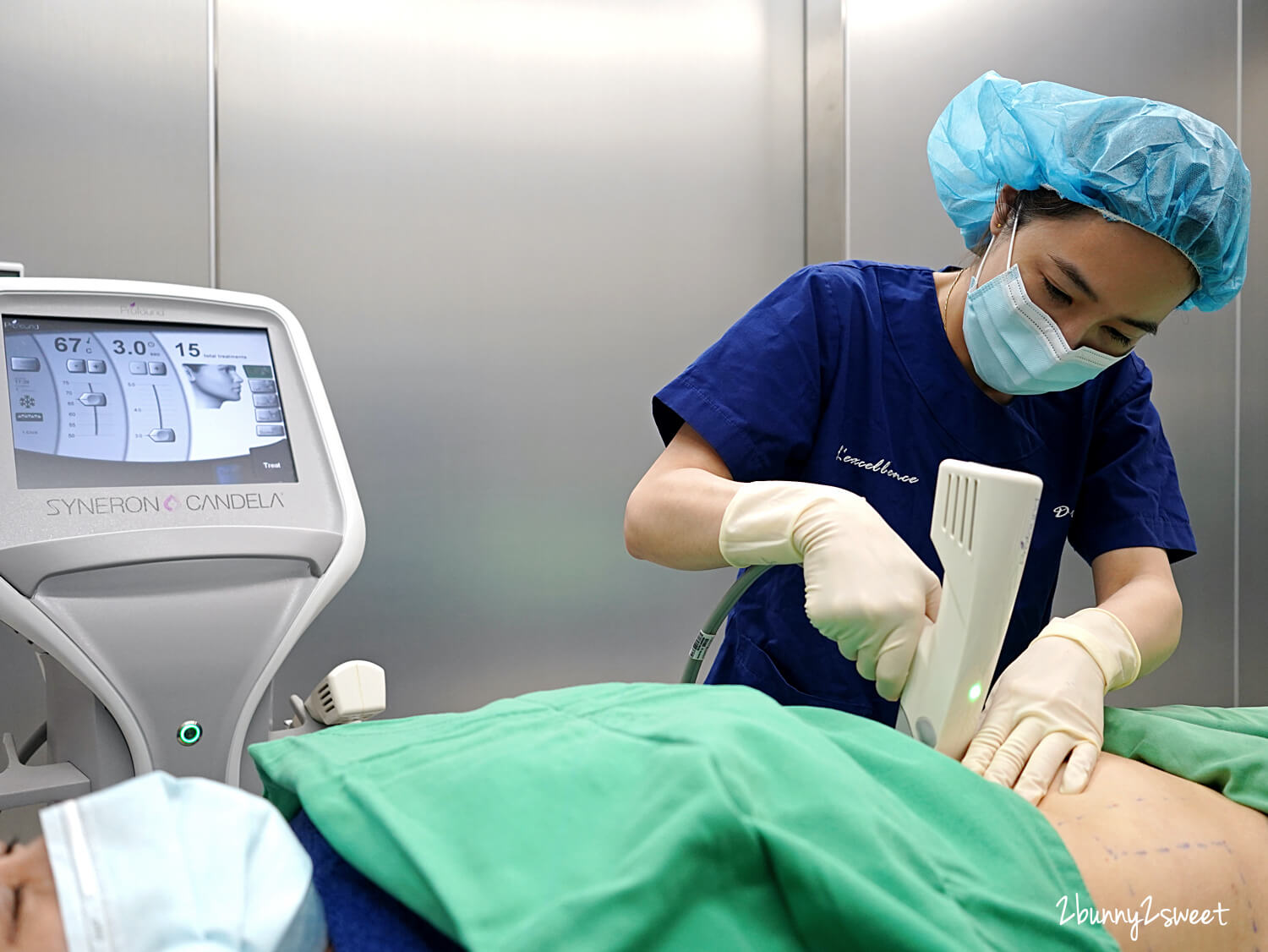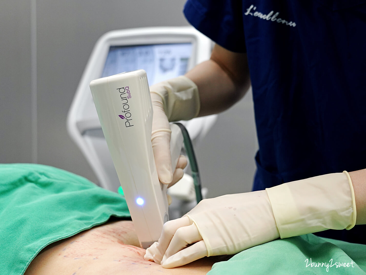 【Profound 魔方 67】的治療過程中兔兒麻都只要躺著就好,醫師拿著一隻像是釘槍的東西在肚皮上釘阿釘~聲音真的很像訂書機,會聽到一個釘下去的聲音,肚皮感覺到微微的麻,因為有麻醉所以大部分區域不太痛~但是還是有某些會感覺到熱感,還好作用時間不長,忍一下就過去了~療程中張醫師還會一直跟我聊天,讓我心情放鬆不少~