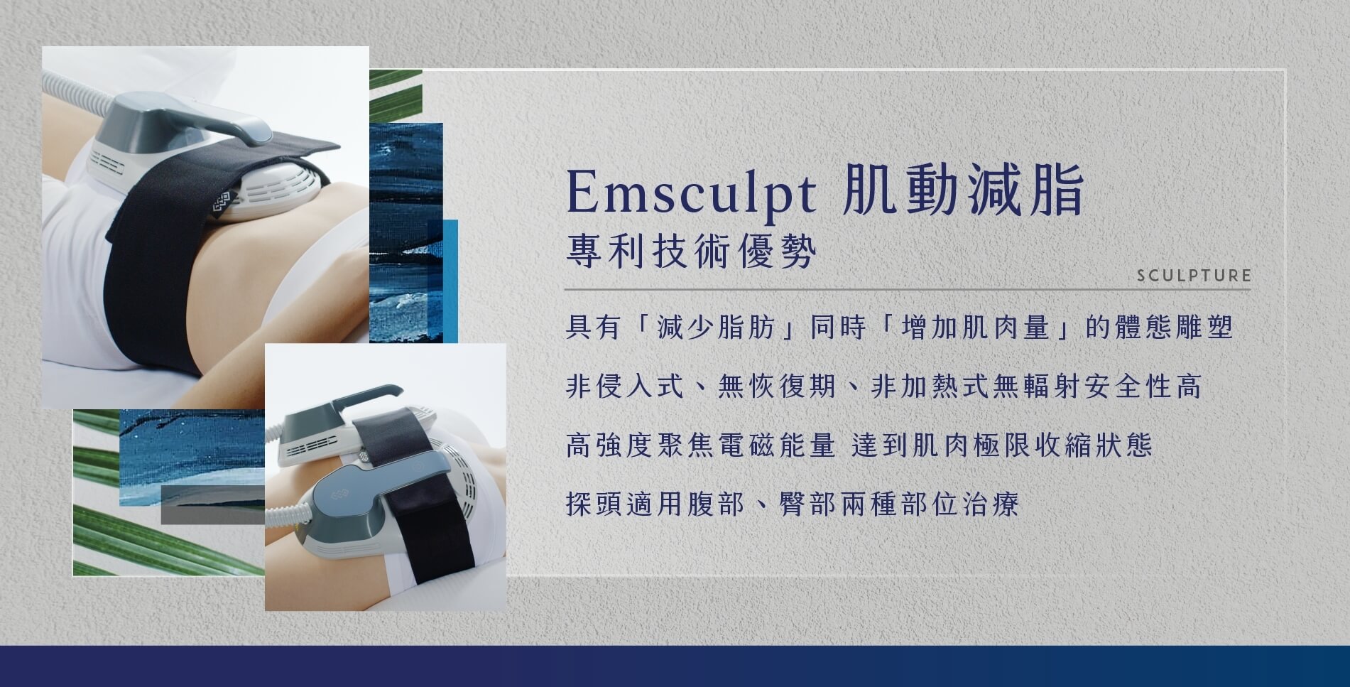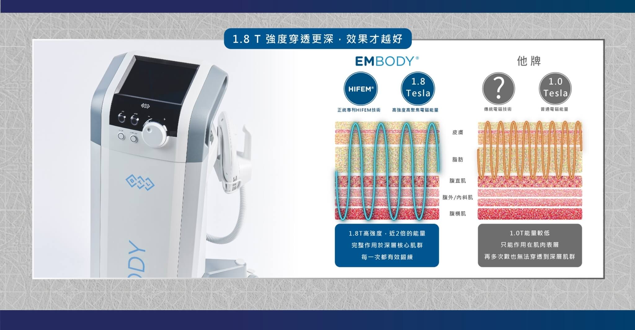 針對現代人最在意的「腹部」核心訓練。作用期間分為三階段不同的電磁能量,能量最高可以穩定輸出1.8Telsa(特斯拉),利用不同的波形及頻率調整,給予肌肉從暖身適應、極限收縮訓練及恢復重塑的安全完整療程。專利HIFEM技術為非侵入式的療程,更在安全性、有效性及效果維持等數據,擁有全球超過15篇臨床醫學文獻證實,同時經過TFDA/FDA/CE多重認證。