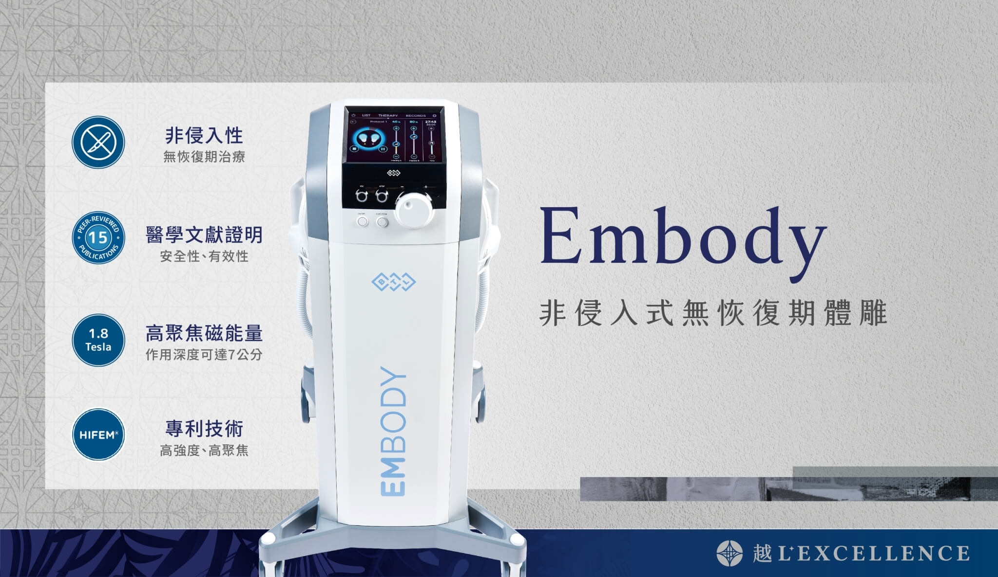 EMBODY是由英國BTL研發製作,並且使用專利HIFEM(High-Intensity Focused Electromagnetic)高強度聚焦磁能技術的核心體雕儀器,可以使肌肉完成在自主運動下無法達到的「超極限收縮」,讓肌肉產生高強度的擴張及收縮,同時深度最深達可達7公分,激活深層的肌群進行運動。