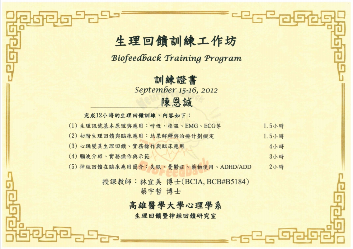 陳恩誠 健康行為管理顧問 學經歷 政治大學資訊科學所博士候選人中原大學心理研究所臨床心理學組健康吉美診所心理中心主任TVBS專欄作家台北市立聯合醫院兼任駐診心理師台北市立萬芳醫院臨床心理師台安醫院兒童發展中心兼任臨床心理師國防醫學院講師 心理師專長 睡眠醫學管理健康行為醫學管理情緒與壓力管理兒童、年長者心理學人際衝突與危機管理生理回饋治療心理學之人工智慧與虛擬實境心理師證照 教育部部定大學講師證照臨床心理師證照生理回饋受訓證照 心理師證照 Previous Next 心理師專欄 Sorry, we couldn't find any posts. Please try a different search.