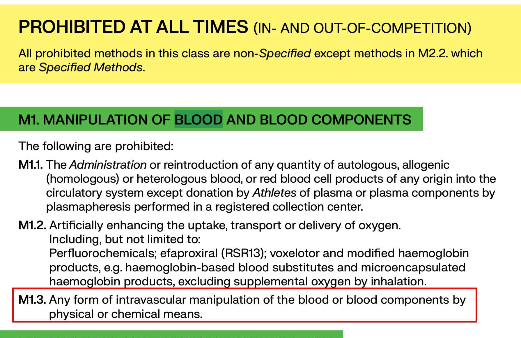 條文中此項目指出,若經由侵入式手段改變血液及血球的狀態是歸屬於禁止範疇,因ILIB靜脈雷射是侵入式的,會改變血球的含氧量跟攜帶養分的能力,因此被列為運動員的禁藥。