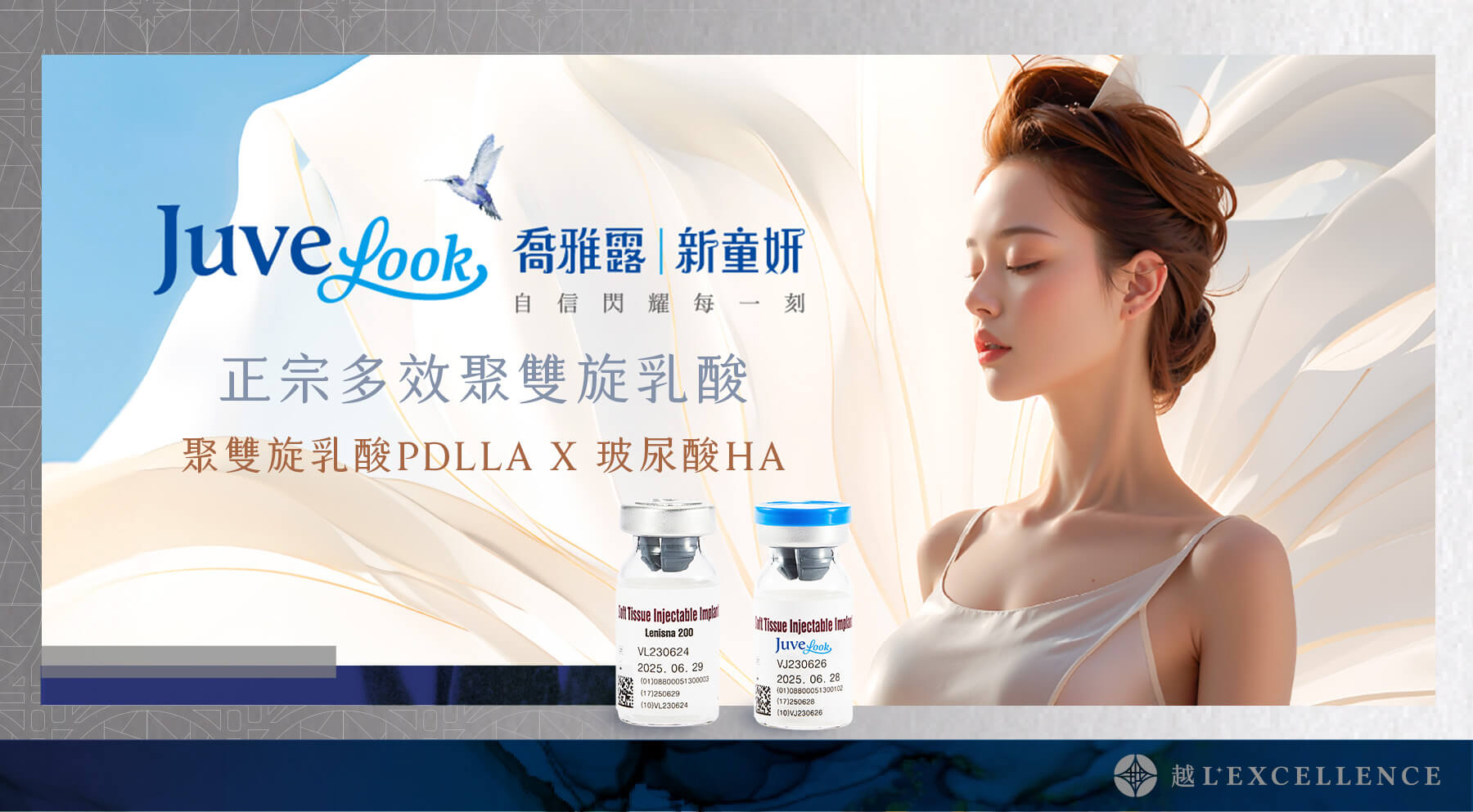 「Juvelook喬雅露|新童妍」是一款新型態的組織增生劑,透過複合式成分設計,結合聚雙旋乳酸PDLLA與玻尿酸HA的雙重功效,幫助肌膚促進膠原蛋白生成,達到緊緻、拉提、飽滿與膚質改善等多重效果。