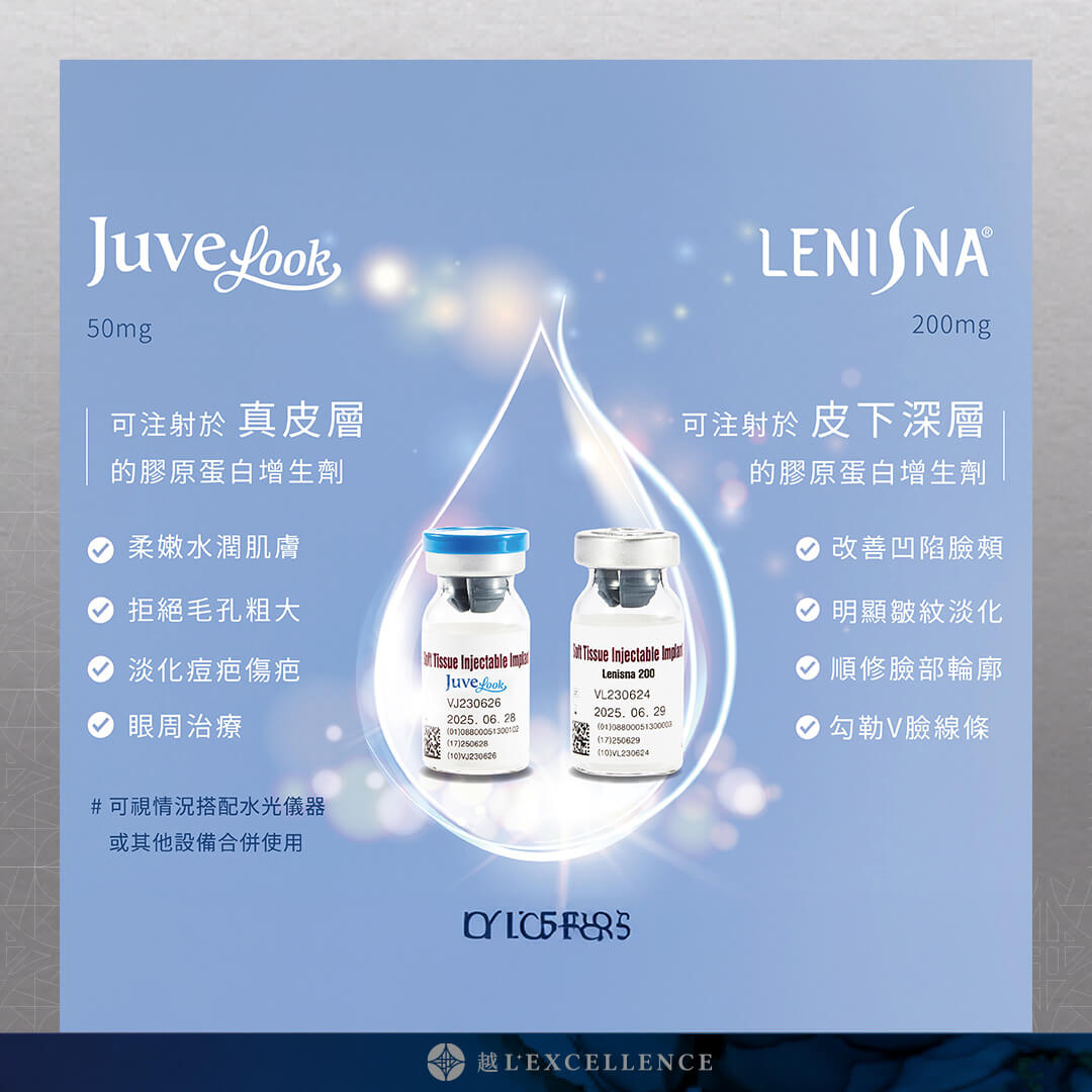 - Juvelook 50mg的微粒較小,適合淺層注射如真皮層,對於膚質紋理改善有極大的幫助,因此常被應用於疤痕、全臉水光等治療。此外針對皮膚較薄處的凹陷填補,如淚溝、頸紋等,也有不錯的效果。