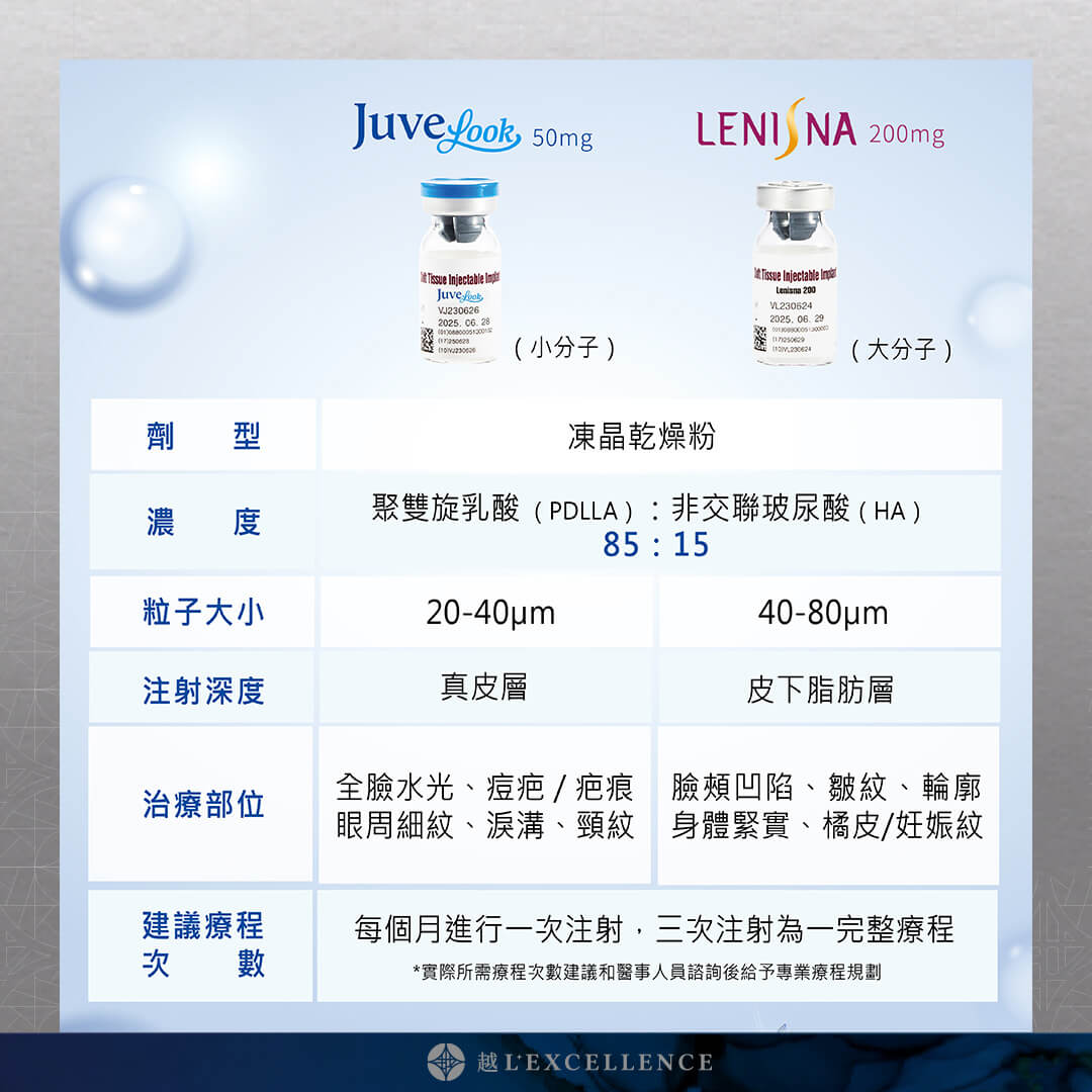 - Lenisna 200mg的微粒較大,建議注射層級較深,適用於深層修復,針對皮膚鬆弛、深層皺紋以及其他較為嚴重的老化跡象,可提供顯著的膠原增生,改善凹陷效果。