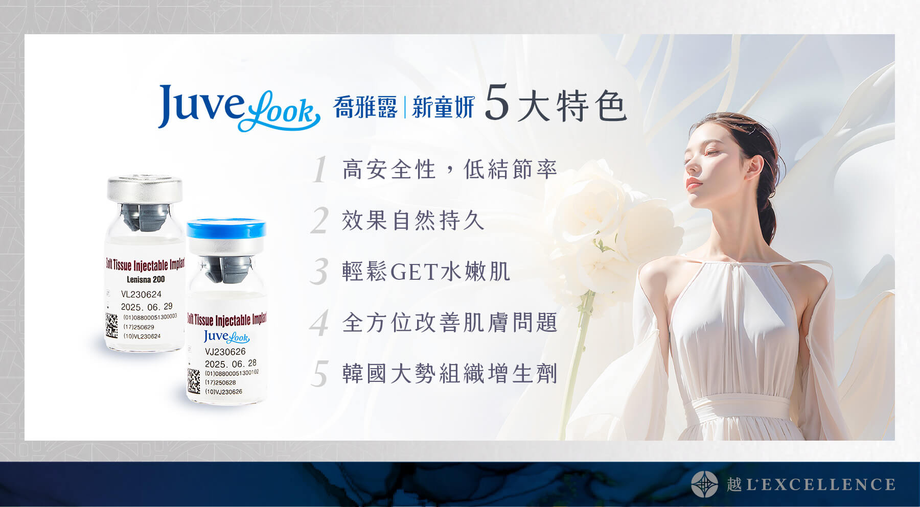 Juvelook喬雅露全球銷售超過70多國,是近年來許多愛美人士的新寵兒。術後低腫脹、低副作用,且膠原蛋白增生效果自然又持久,讓Juvelook喬雅露榮獲2022年與2023年的韓國消費者大賞「Skin booster of the year」,亦是目前韓國銷售市佔第一名的組織增生劑品牌。