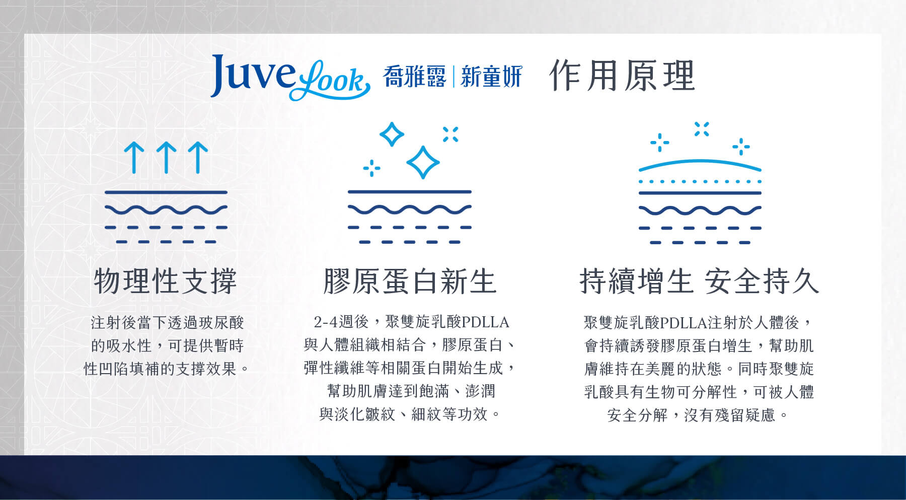 Juvelook喬雅露是透過注射聚雙旋乳酸PDLLA微粒,與傳統的玻尿酸填充原理不同,Juvelook喬雅露會誘發人體產生自己的膠原蛋白,效果會比起單純填充針劑更加自然,維持時間也較長。